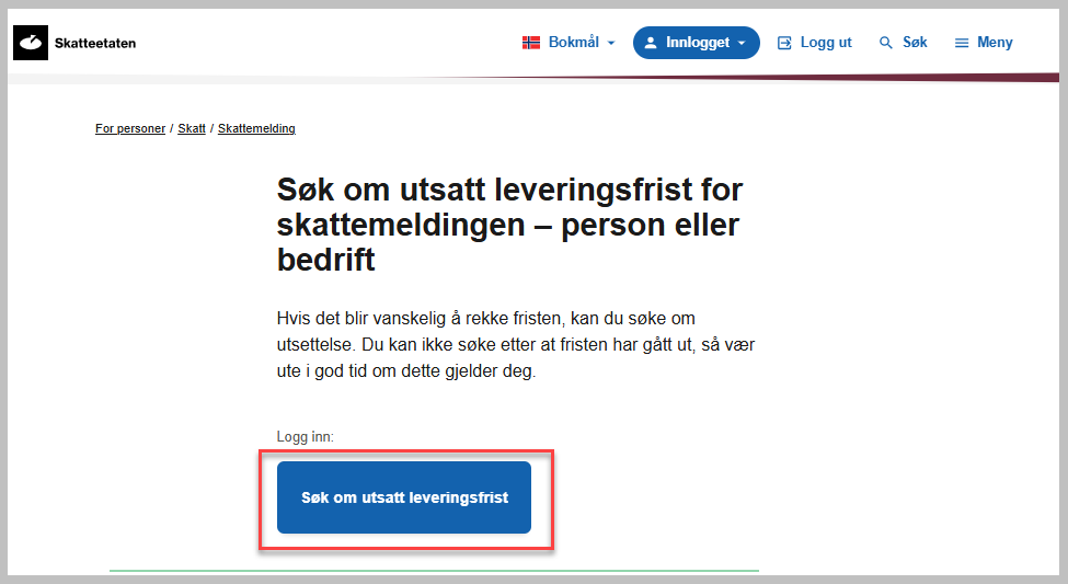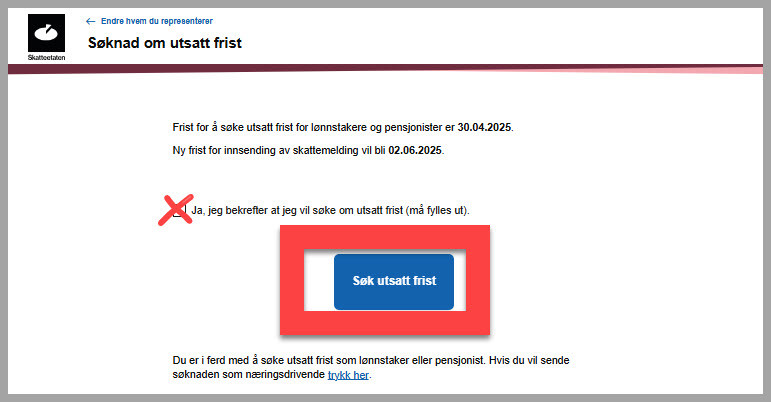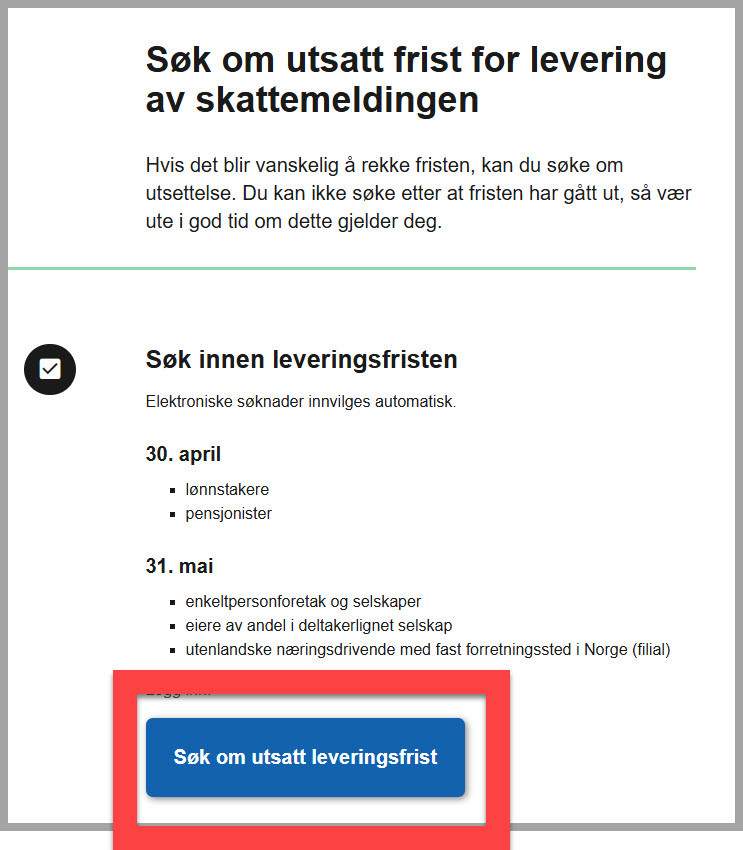 Hvis du trenger mer tid, kan du enkelt be om én måneds utsettelse, noe som automatisk innvilges. Her er stegene for å søke: